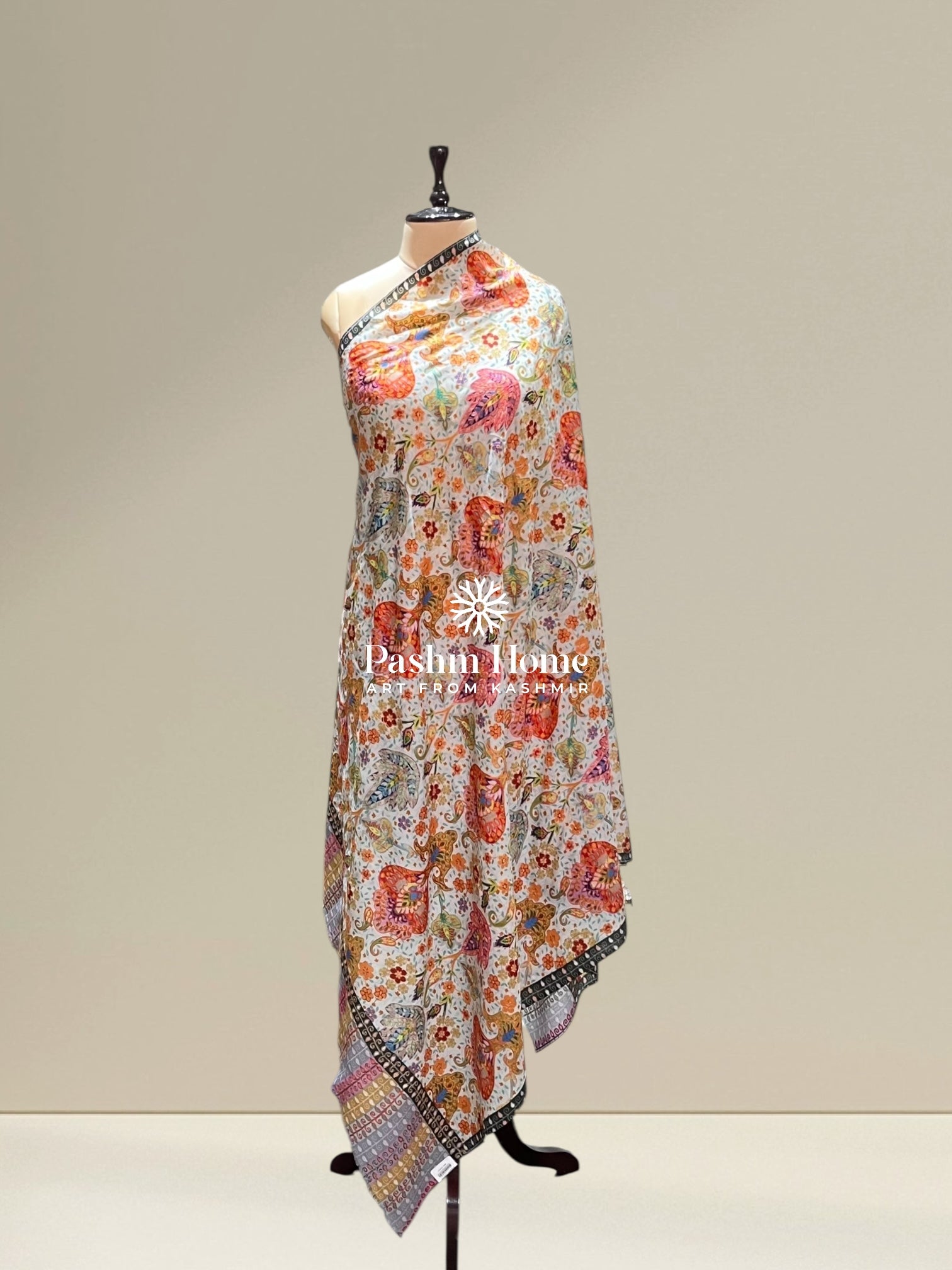 Exclusive White Multicolour Fine Wool Kalamkari Shawl With Intricate Work