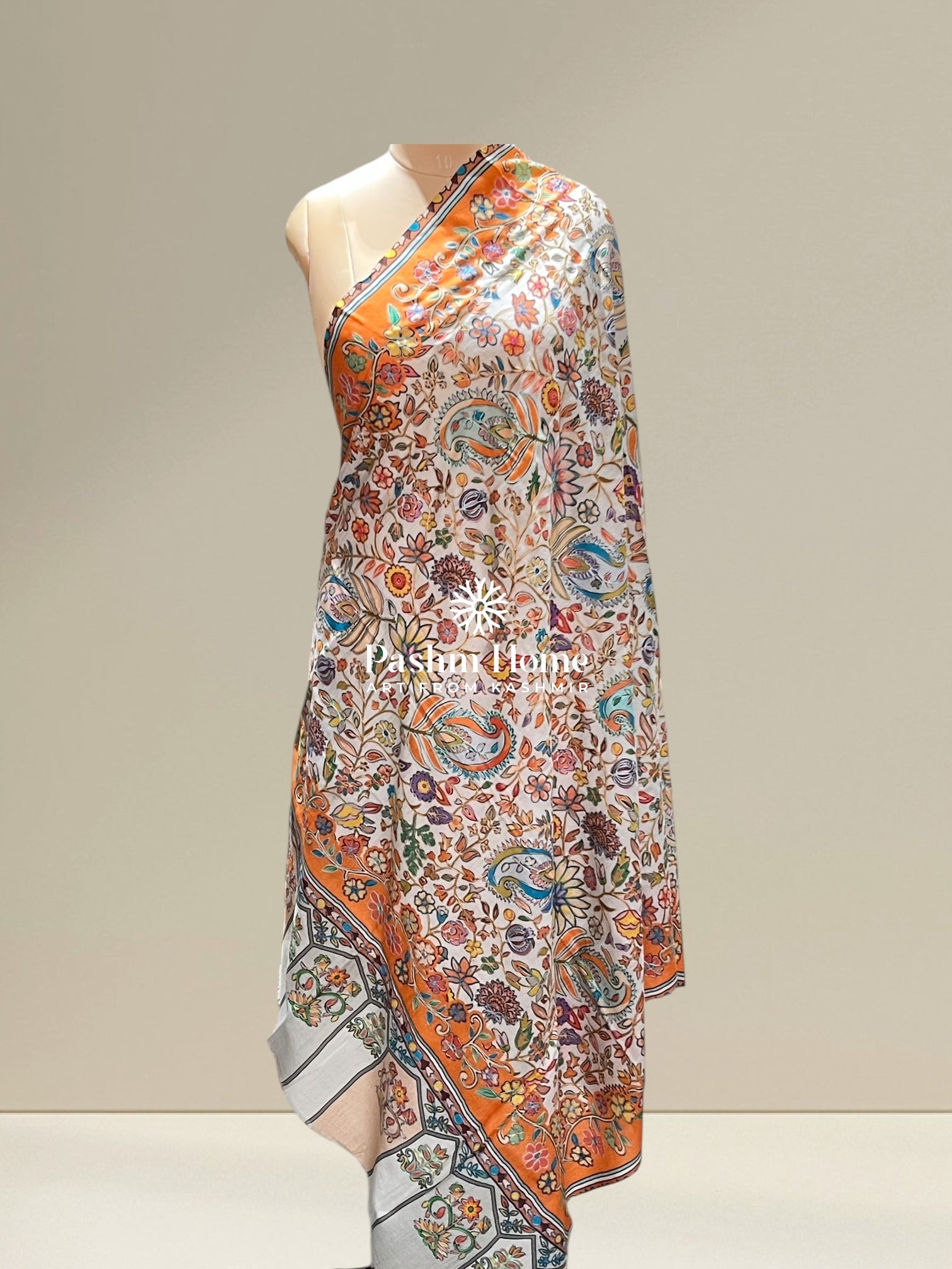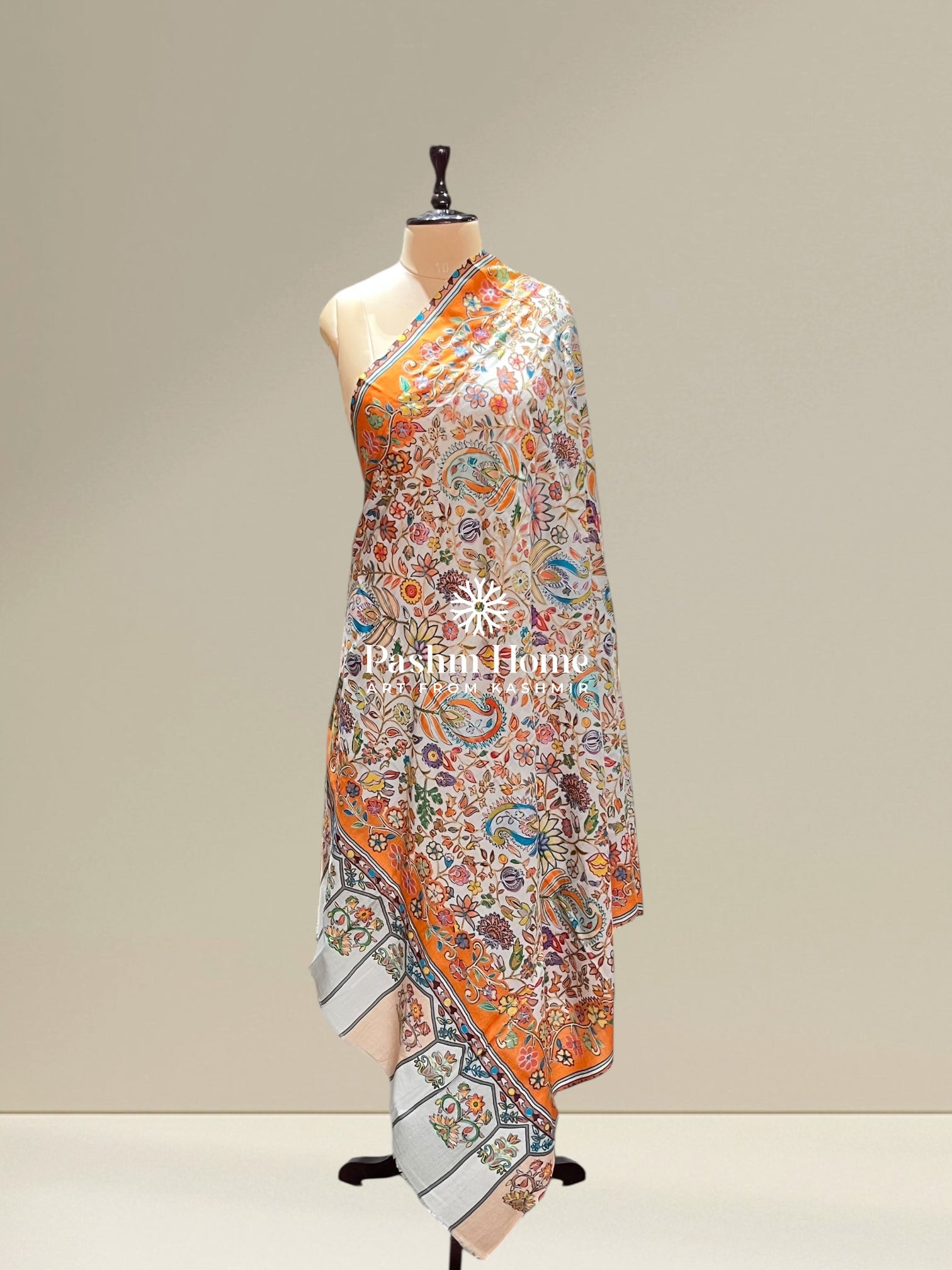 White Orange Floral Fine Wool Kalamkari Shawl With Intricate Work